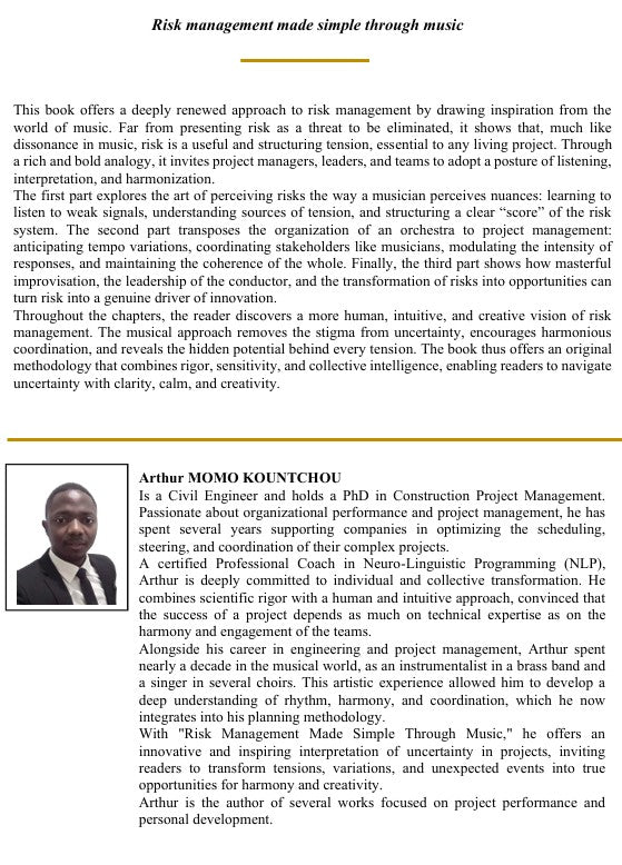 Throughout the chapters, the reader discovers a more human, intuitive, and creative vision of risk management. The musical approach removes the stigma from uncertainty, encourages harmonious coordination, and reveals the hidden potential behind every tension. The book thus offers an original methodology that combines rigor, sensitivity, and collective intelligence, enabling readers to navigate uncertainty with clarity, calm, and creativity.