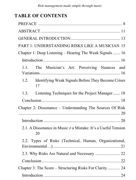 The first part explores the art of perceiving risks the way a musician perceives nuances: learning to listen to weak signals, understanding sources of tension, and structuring a clear “score” of the risk system. The second part transposes the organization of an orchestra to project management: anticipating tempo variations, coordinating stakeholders like musicians, modulating the intensity of responses, and maintaining the coherence of the whole. Finally, the third part shows how masterful improvisation, the leadership of the conductor, and the transformation of risks into opportunities can turn risk into a genuine driver of innovation.
