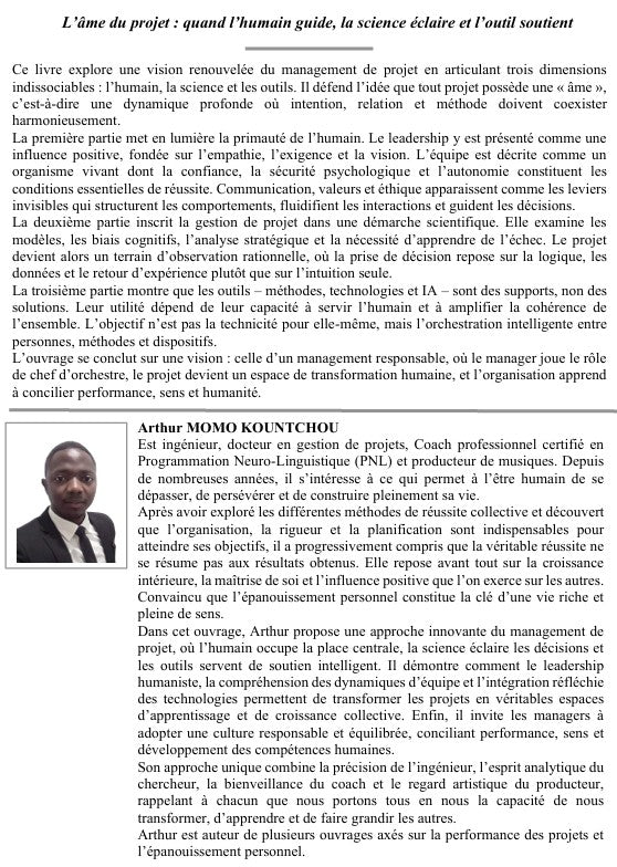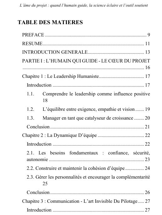 Ce livre explore une vision renouvelée du management de projet en articulant trois dimensions indissociables : l’humain, la science et les outils. Il défend l’idée que tout projet possède une « âme », c’est-à-dire une dynamique profonde où intention, relation et méthode doivent coexister harmonieusement.