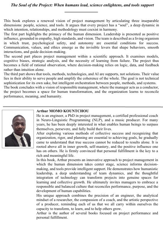 This book explores a renewed vision of project management by articulating three inseparable dimensions: people, science, and tools. It argues that every project has a “soul”, a deep dynamic in which intention, relationships, and methodology must coexist in harmony.